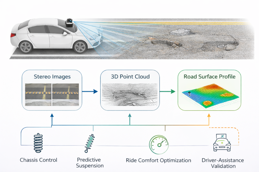 The purpose of this thesis is to design and train an algorithm capable of extracting detailed road surface profiles from 3D LiDAR point cloud data. The research will investigate advanced filtering techniques, surface reconstruction methods, and machine learning models to accurately detect road irregularities such as bumps, potholes, and uneven surfaces. The reconstructed road profile can be used to enhance chassis control systems, predictive suspension tuning, and ride comfort optimization, as well as to support advanced driver-assistance validation. The work will involve both simulation and experimental datasets, with validation under different road and environmental conditions.
