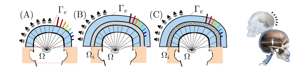 DETAILS: the aim of this project is to study a metamaterial structure capable of focusing ultrasound from outside to the inside the skull. In this field, the state-of-the-art ultrasound technology features a hemispherical transducer array with many piezoelectric elements operating around a central frequency of 650 kHz. By leveraging complex electronic circuits the system allows delivering tailored amplitudes and phases to each transducer, focusing sound from outside to inside the skull into a spatial region as small as a wavelength. However, skull-induced aberrations reduce the maximum pressure, shift the pressure peak, broaden the main lobe, and increase sidelobe effects.